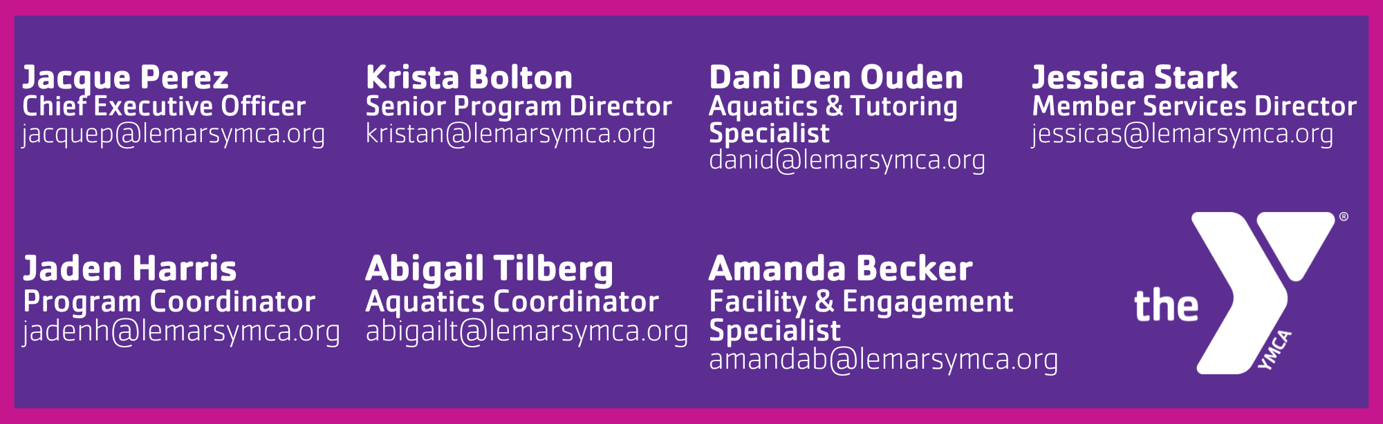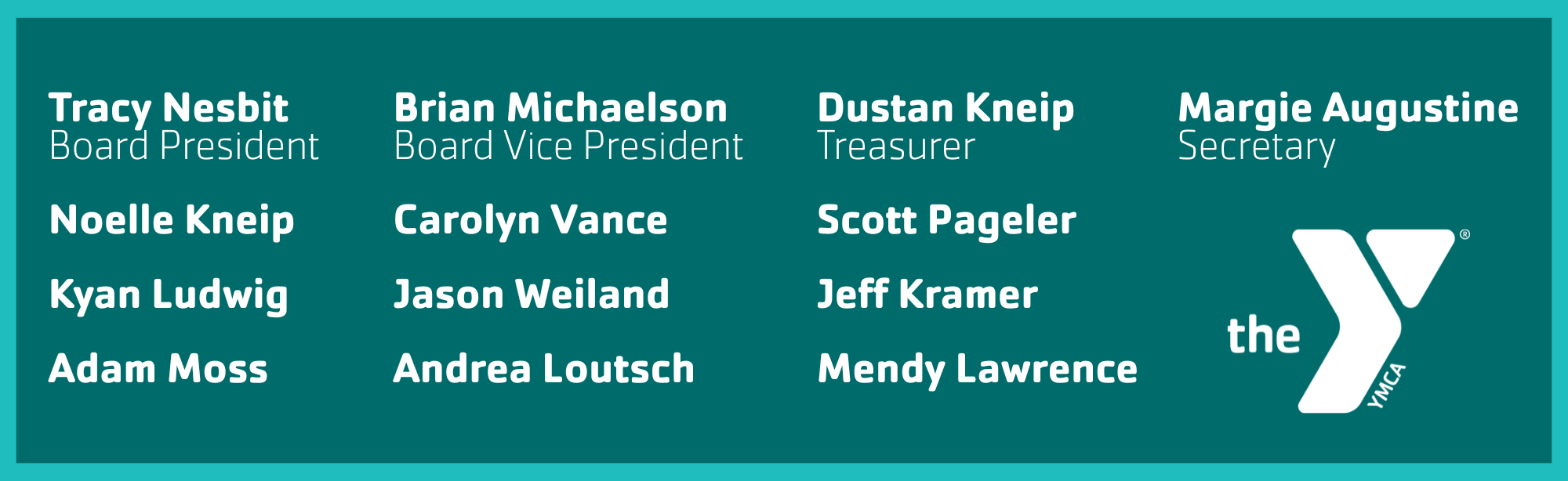 The Le Mars YMCA is a no-for-profit community service organization which has no private owners or stockholders. The Y is governed by a board of community volunteers who represent the Y’s community. Here are the Le Mars YMCA’s current Board of Directors who have a vested interest in fostering connections and building relationships with our staff, members, participants and guests.